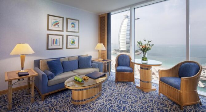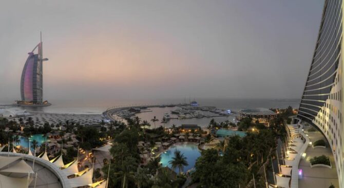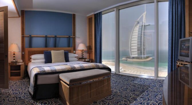 Из окон отеля Jumeirah Beach Hotel открывается потрясающий панорамный вид на Персидский залив. Здесь посетители могут пользоваться приватным песчаным пляжем, посещать около 20 барных и ресторанных заведений, для полноценного отдыха здесь также есть шесть бассейнов и целый скалодром, но самое главное, каждый из постояльцев отеля может бесплатно ходить в аквапарк Wild Wadi и пользоваться любыми аттракционами.