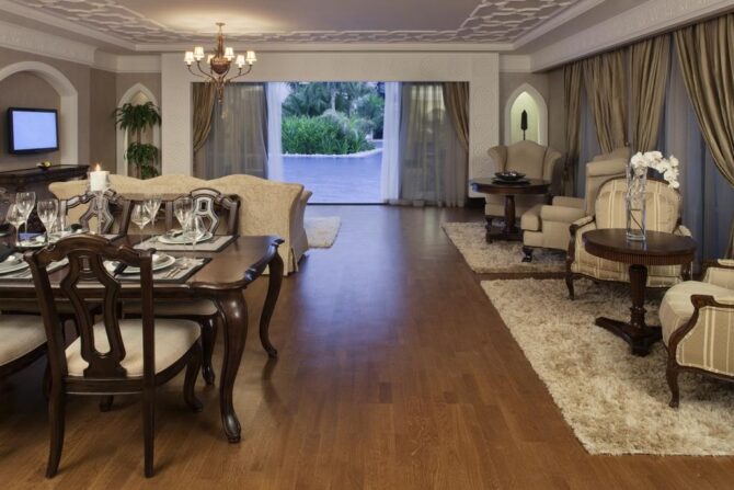 В Jumeirah Dar Al Masyaf есть персональные дворецкие, которые смогут выполнить почти любую вашу просьбу по первому желанию. Каждый из номеров оборудован мебелью, доставленной из арабских стран.