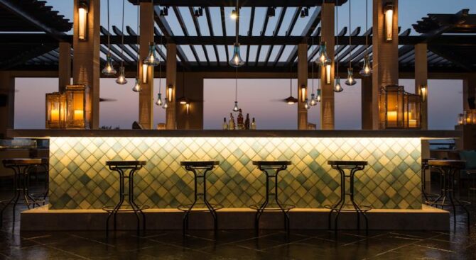 Виллы оформлены конструкциями из темного дерева и турецкого мрамора, а сам фасад вымощен плиткой из керамики. Внутри номеров есть полноценная кухня и обеденный зал. В наличии здесь также ресторан, посетители рекомендуют попробовать здесь ливанскую и французскую кухню. Для любителей выпить здесь есть бар Voda и несколько лаундж-зон.