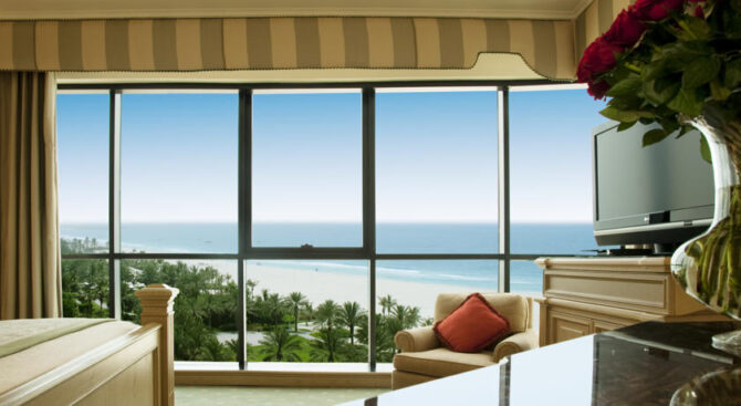 При необходимости отели организуют трансфер по доставке постояльцев из аэропорта на вертолете или же на автомобиле Rolls-Royce с персональным шофером. В каждом люксовом номере гостиницы стоят специальные окна для панорамного вида на Персидский залив.