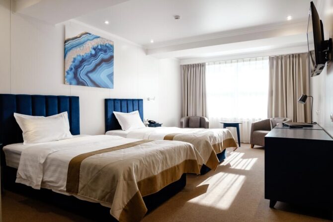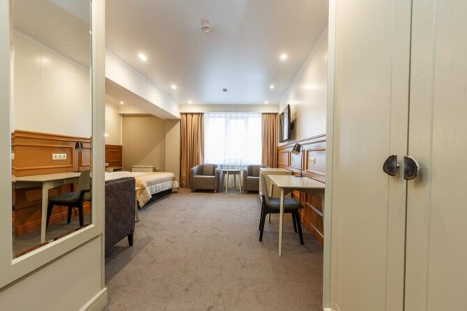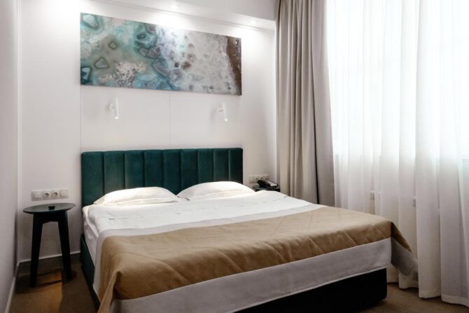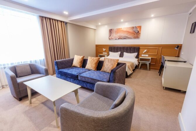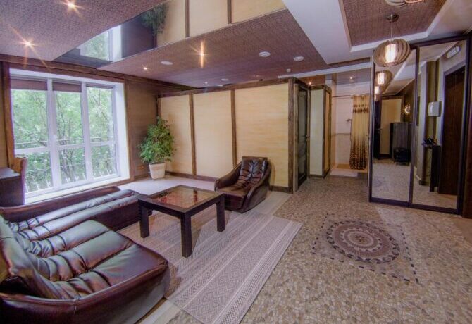 Еще один уютный 4-звездочный отель расположен в центре Хабаровска. В фонде 47 номеров: эконом, стандарт и улучшенный стандарт. Над интерьерами поработали дизайнеры, поэтому гости получают эстетическое удовольствие находиться в них. Лаундж-кафе с летней террасой специализируется на европейской кухне. Утром накрывается шведский стол. Основной контингент постояльцев – это деловые люди, семьи, туристы.