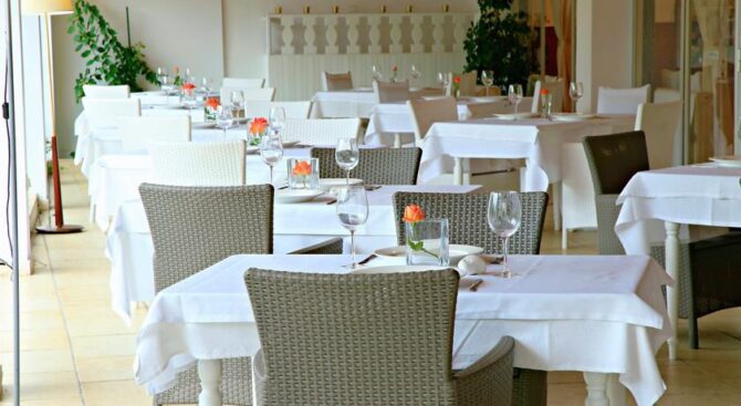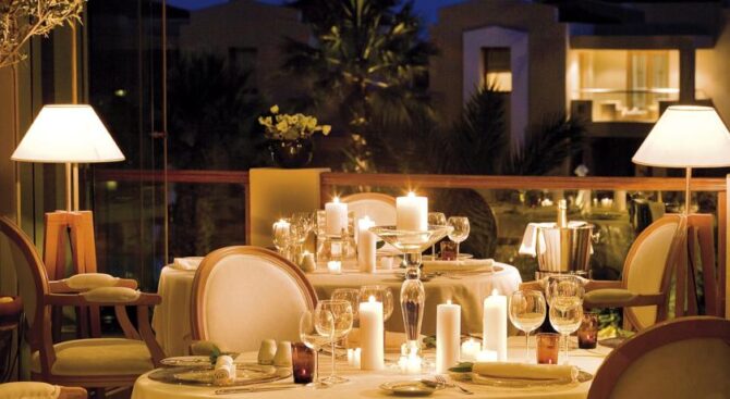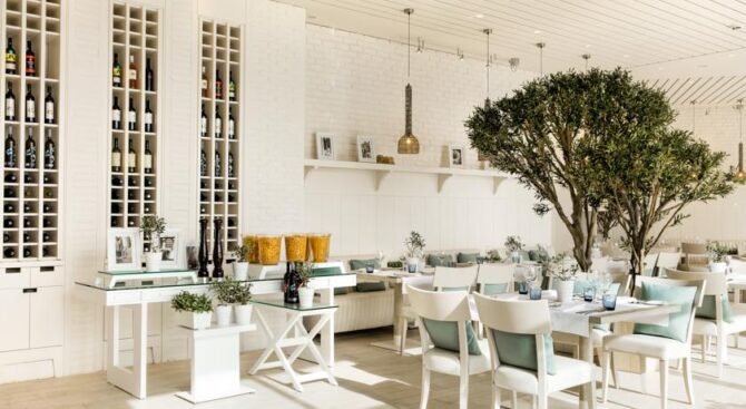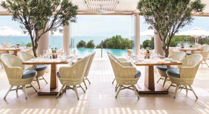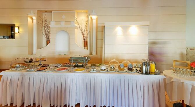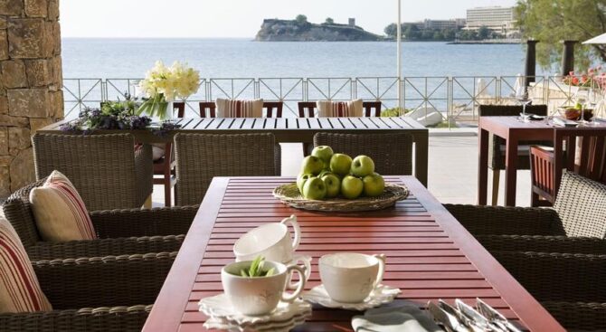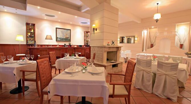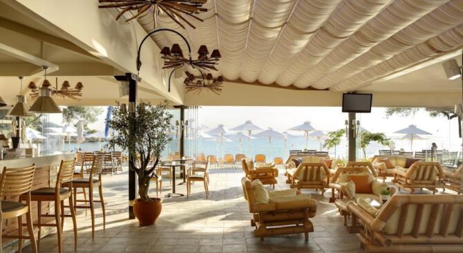 На территории комплекса 3 ресторана – в одном из них подают греческие блюда, в других – европейские. Есть также бар на пляже и возле бассейна. В ресторанах формируется завтрак «шведский стол», а вечером играет живая музыка. Можно заказывать еду в номер.