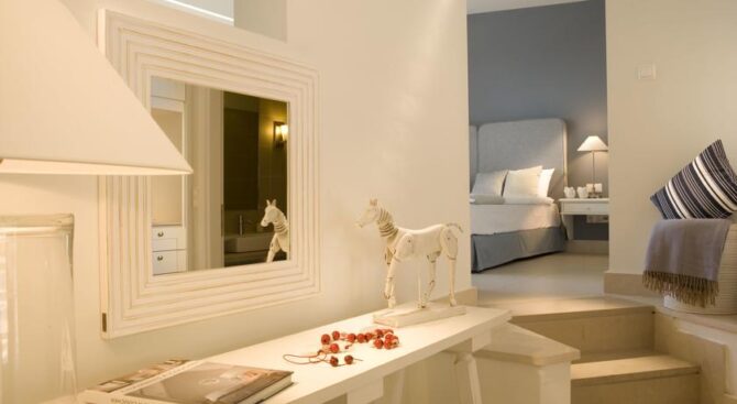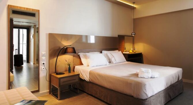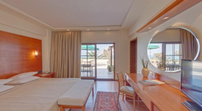 В отеле есть стандартные номера и люксы, все они оформлены в современном, греческом стиле. В каждом номере есть телевизор, кондиционер, мини-бар, отдельная ванная комната с необходимыми принадлежностями, есть тропический душ. Выделена обеденная зона, где есть электрочайник и холодильник.