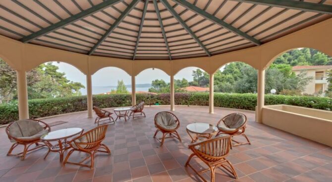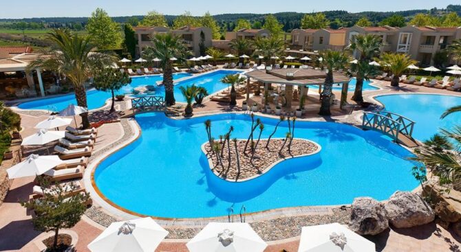 В зеленой бухте расположен еще один пятизвездочный отель Sani Club в Халкидики. Расстояние до пляжа можно преодолеть за 8 минут, отелю принадлежит собственный пляж с шезлонгами, которые не нужно занимать заранее. Сам комплекс расположился на территории курорта Кассандра, оборудован он и внутренним бассейном.