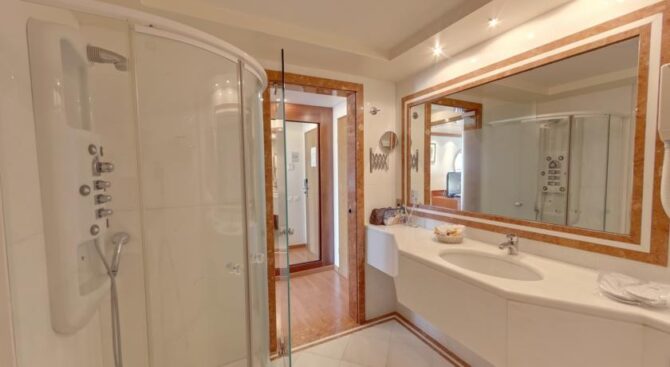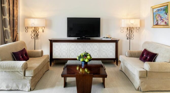 В каждом номере отеля предусмотрен кондиционер, собственный санузел с ванной и душем, оборудованный всем необходимым, сейф, мультимедийный плеер, телевизор со спутниковым ТВ. В каждом номере есть собственный балкон, с видом на сад или море.