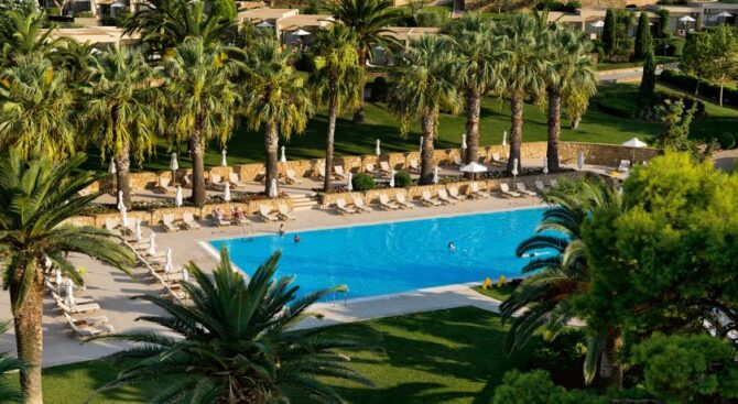 Отель Possidi Holidays Resort & Suite Hotel в Греции, на Халкидики считается одним из лучших. Он расположен на краю соснового леса, в комплекс входит собственный пляж. Пляж оборудован шезлонгами, зонтиками и волейбольной площадкой.