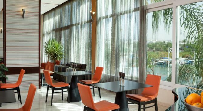 Отель имеет свой ресторан Dolphin, в котором можно заказать натуральные израильские блюда, а также каждое утро здесь накрывают шведский стол. Отдыхать в этот отель имеет смысл ехать с детьми. Здесь для них здесь предусмотрен целый развлекательный комплекс, в котором они смогут провести время не только весело, но и с пользой. Напротив комплекса находится много полезной инфраструктуры, удобное расположение отеля делает его притягательным для туристов.