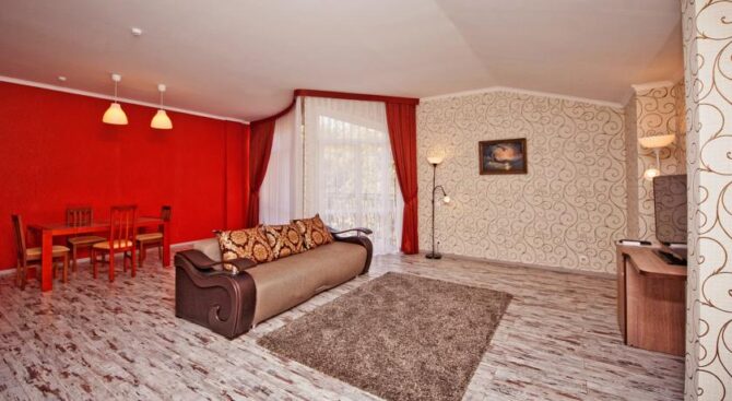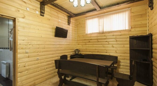 Апартаменты обустроены отлично. Обстановка внутри весьма богатая, детали интерьера подобраны изысканно. При этом Кедровая Роща находится в средней ценовой категории, по отношению к другим отелям и комплексам. Комнаты там умеренной величины, зато везде есть отличные ванные. Тапочки для удобства идут в комплекте с феном.