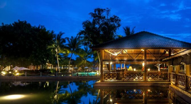 Отель The Leela Goa расположен в живописнейшем месте города Кавелоссим. От песчаного пляжа его отделяет несколько минут спокойной ходьбы. Для купания на территории отеля оборудовано 2 бассейна. А из номеров отеля можно любоваться не только парком и внутренним двориком, но и видом на лагуну.