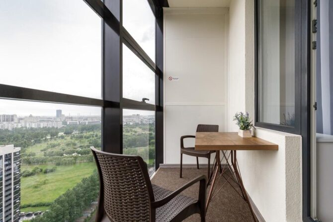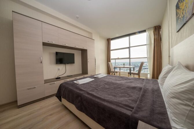 Апарт-отель предоставляет благоустроенные квартиры для кратковременного и долгосрочного проживания. Все номера комфорт-класса. На территории работает ресторан. Из панорамных окон открывается живописный вид на парк. До станции метро «Московская» идти 15 минут. Рядом находится остановка общественного транспорта. Действует служба по доставке продуктов, в том числе завтраков. Стойка регистрации находится на первом этаже корпуса Е. На кухнях установлены варочные панели, есть вся необходимая посуда. Во дворе дома расположены супермаркет 24 часа, ресторан.
