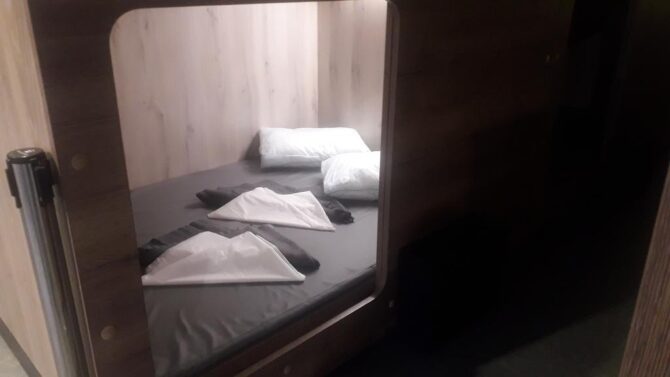 Капсульный отель расположен на 2 этаже Международного терминала аэропорта Пулково. Он работает круглосуточно. Капсулы рассчитаны на одного или двух человек. Гостям предоставляются одеяла, подушки, одноразовое постельное белье. Внутри номера-капсулы есть розетки для зарядки гаджетов, освещение. Доступен бесплатный вай-фай. Установлен почасовой тариф оплаты проживания.