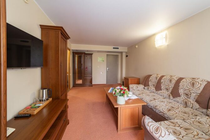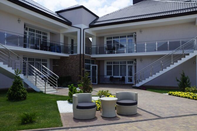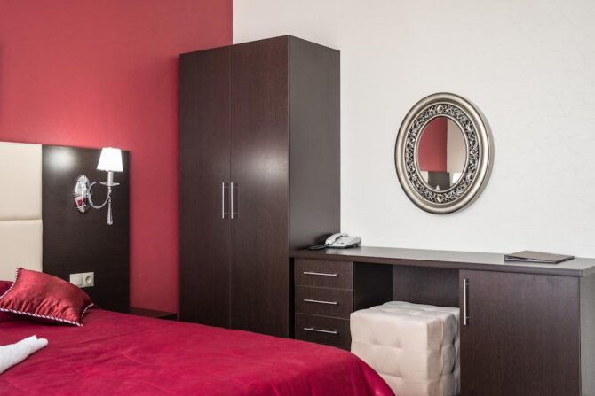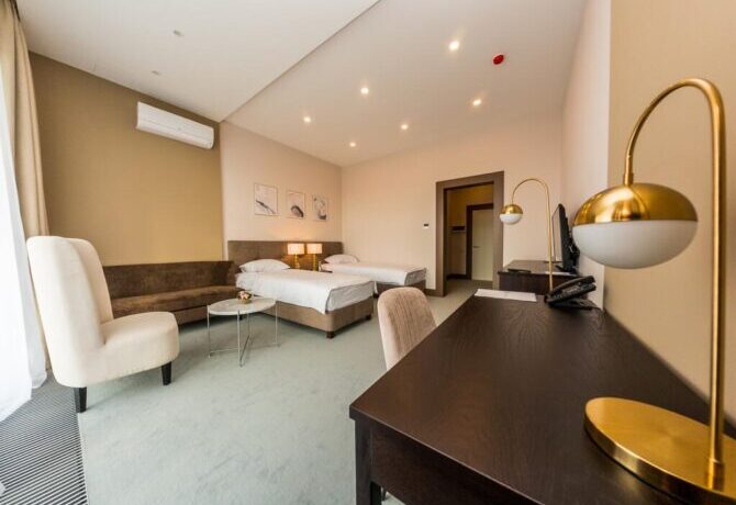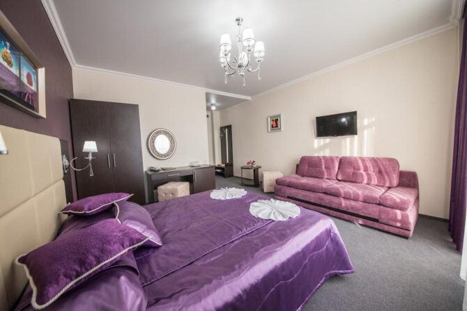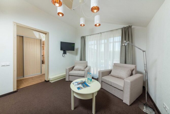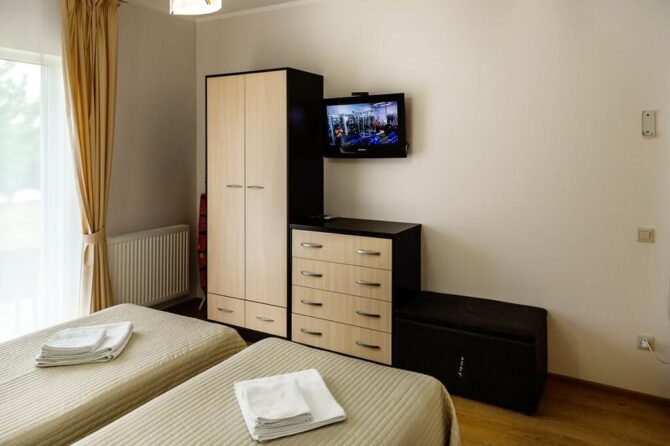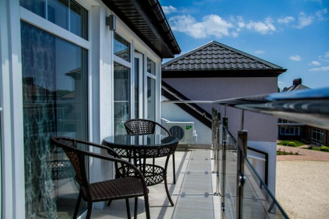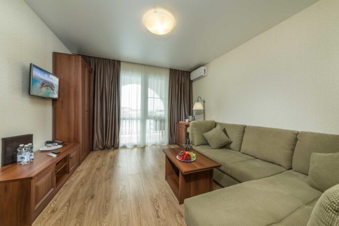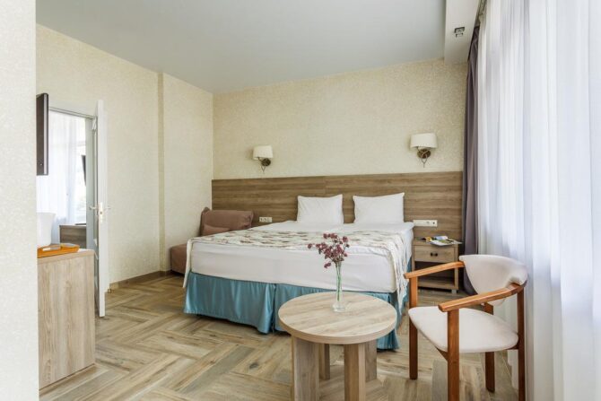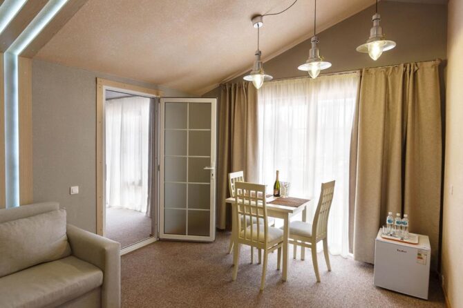 В 6 километрах от аэропорта Витязево находится 3-звездочный отель с номерам класса люкс, семейные и стандарты. У каждого номера есть своя терраса для отдыха и принятия пищи. К услугам гостей: питание по системе меню-заказ, бассейн, открытая охраняемая парковка, трансфер по предварительной заявке, профессиональный массажист с медицинским образованием. Для детей оборудована игровая площадка, проводятся развлекательные программы с аниматорами. За отдельную плату предоставляется детская кроватка. В полукилометре от комплекса расположен частный пляж протяженностью 300 м. Из аэропорта до гостиницы на такси ехать 15 минут.
