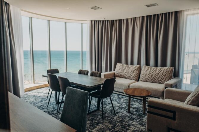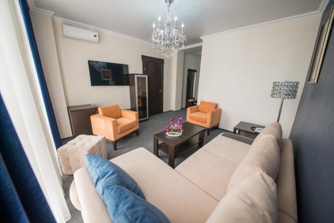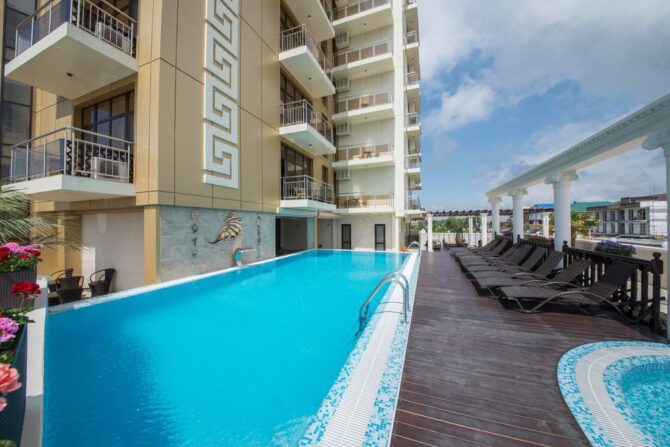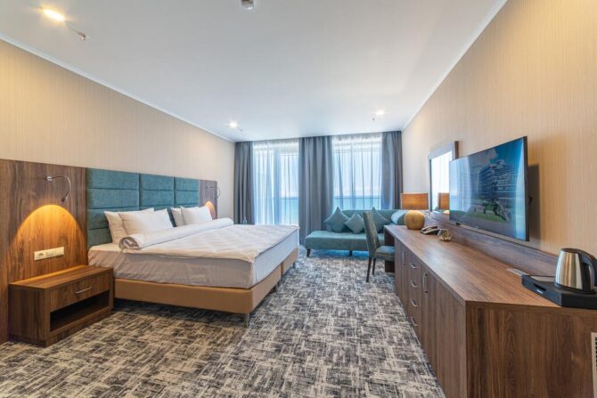 Фешенебельный 5-звездочный отель расположен на берегу Черного моря в 11 км от аэропорта. Для размещения гостей подготовлено 202 номера. В сервис входят: открытый инфинити-бассейн, room service, тренажерный зал с профессиональными инструкторами, спа-центр с крытым бассейном, частный пляж с шезлонгами, навесами, душевыми кабинами, детская игровая комната. Услуги акватермальной зоны с детским и взрослым бассейнами входят в стоимость проживания. Для постояльцев накрывается общий завтрак. Обед и ужин по меню предлагают сразу 5 ресторанов, расположенных на территории. Администраторы на стойке регистрации подскажут интересные экскурсионные маршруты. В отеле можно взять автомобиль напрокат.