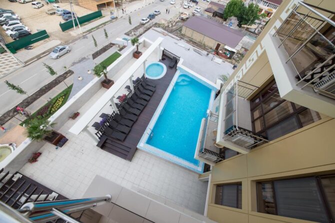 «Эта многоэтажная гостиница находится в центре Витязево. Сервис продуман до мелочей: возят и привозят с пляжа бесплатно. У бассейна подают пиво, лимонады, мороженое. Доступны 4 вида бань. В номере чисто. Хорошее питание» Егор, Россия