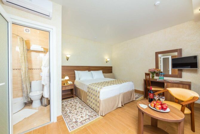 4-звездочный отель работает по системе «Все включено». К услугам гостей – 4 бассейна, spray-парк, свой пляж, анимация, игровой центр, комфортабельные номера со всеми удобствами. 800 метров до моря, есть доставка. В СПА-комплексе оборудованы турецкая баня, финская сауна, инфракрасная кабина, джакузи. В детской комнате предоставляются услуги няни. Поездка до аэропорта занимает 15 минут (10 км), можно заказать трансфер.