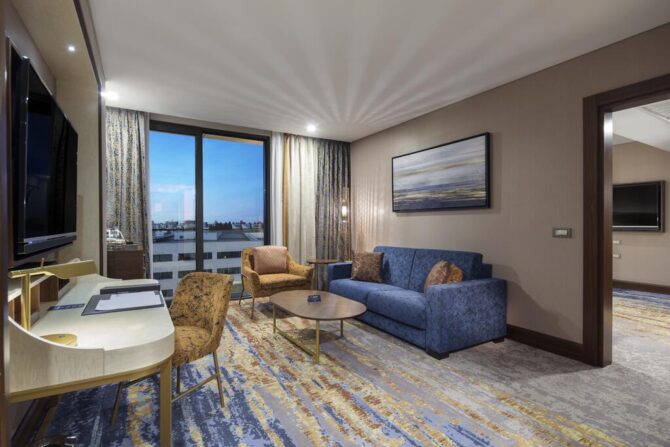5-звездочный отель сети Doubletree By Hilton расположен в 8,5 км от аэропорта Анталии. К услугам гостей крытый бассейн и бассейн на крыше, фитнес-центр и спа-салон, а также теплое печенье DoubleTree по прибытии. Завтрак накрывается по системе шведской линии или подается в индивидуальном порядке. До пляжа Мермерли полтора километра. Можно доехать на общественном транспорте или пройтись пешком. Администратор на ресепшн подскажет самый подходящий маршрут. Трансфер в отель оплачивается отдельно. С животными приезжать нельзя.