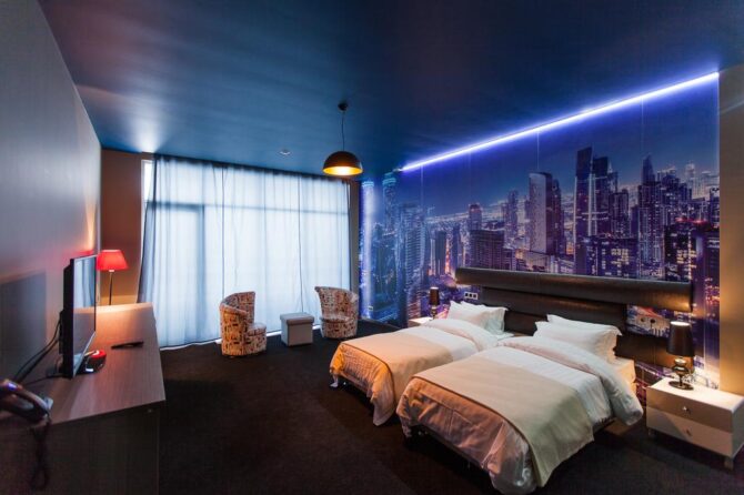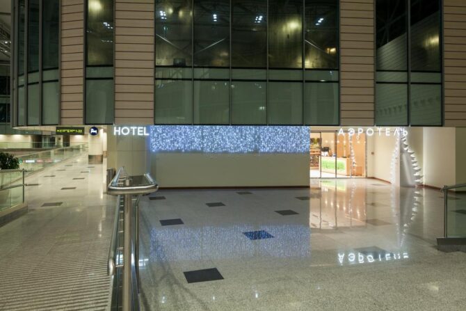 Отель на 35 номеров расположен на 2 этаже пассажирского терминала. Один из номеров полностью приспособлен для людей с ограниченными возможностями. В нем есть тревожная кнопка, оборудована санитарная комната, на двери установлен электропривод с дистанционным управлением. Здесь принимают с домашними животными. Оплата почасовая (начиная с 2-х часов проживания). Отсутствует фиксированное время заезда и отъезда. Гости оплачивают фактическое время пребывания. На стойке регистрации продаются безалкогольные напитки и легкие закуски. Есть интернет и бесплатный круглосуточный трансфер. Постояльцам предоставляются 20% скидки в ресторане и тренажерном зале отеля-партнера, который находится в 500 метрах.