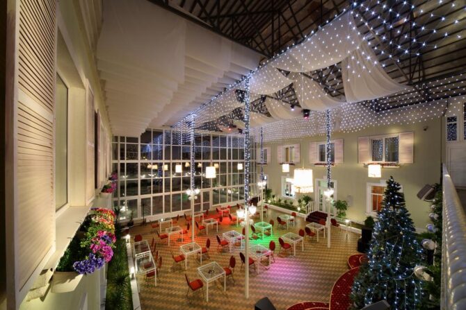 «Большая и ухоженная территория. По ночам используется подсветка. В зоопарке можно покормить животных. В нем обитают олени, верблюды, мишки, эму, еноты-полоскуны, лисы, зайцы и другие животные. Рекомендую обратить внимание на рестораны: Петрушка — очень красивый с авторской кухней и огромными ценами, обеденная зона «Кандинский» обслуживает по шведской системе. Готовят большое количество блюд на гриле – рыбу, мясо, овощи. Большой выбор спиртных напитков. Вегетарианцам и детям также есть, что покушать. На территории есть вертолетная площадка, за полет в течение 10 минут цена составляет 7000 рублей на троих, а полетать над МКАД ночью 35 тысяч. Бассейн (входит в систему все включено) маловат, выручило джакузи с мощными струями воды, выходить не хотелось. Две бани: финская и турецкая. Полотенца лежат в раздевалке. Есть детская игровая комната с аэрохоккеем. По вечерам открывается караоке-бар. Когда мы зашли, играла музыка, но кроме персонала никого не было. Видимо, было еще мало времени. На ресепшн можно попросить бесплатно велосипеды. Персонал заслуживает особой похвалы: с нами здоровались и улыбались даже на территории мимо проходящие сотрудники отеля. Советую прогуляться в соседний конный парк Русь. У них тоже огромная территория. Вход бесплатный» Татьяна, Россия