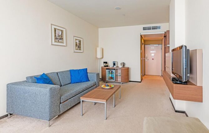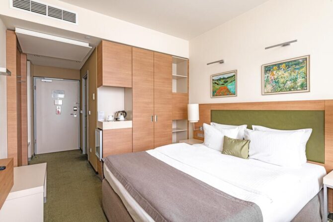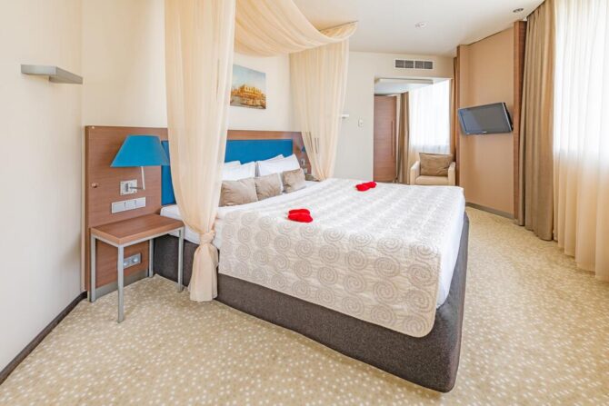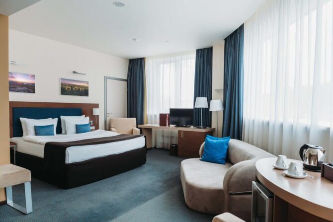 Этот отель, наоборот, подойдет тем, кто стремится быть в центре событий и развлечений. Уровень комфортности – 3 звезды. Но не это привлекает туристов. Здание гостиницы является частью огромного развлекательного комплекса, в который входит крупнейший в Европе аквапарк «Лимпопо». В 5-ти минутах ходьбы расположен ТРЦ «Глобус». Это огромный центр развлечений с кинотеатрами, тренажерным залом, кафе, детскими игровыми комнатами. Для размещения гостей предоставляется 127 номеров на выбор – от стандартов до люксов. Из них 11 являются семейными. Расстояние до аэропорта составляет 16 км. Можно доехать на общественном транспорте или такси. Приблизительное время в пути – 20 минут.