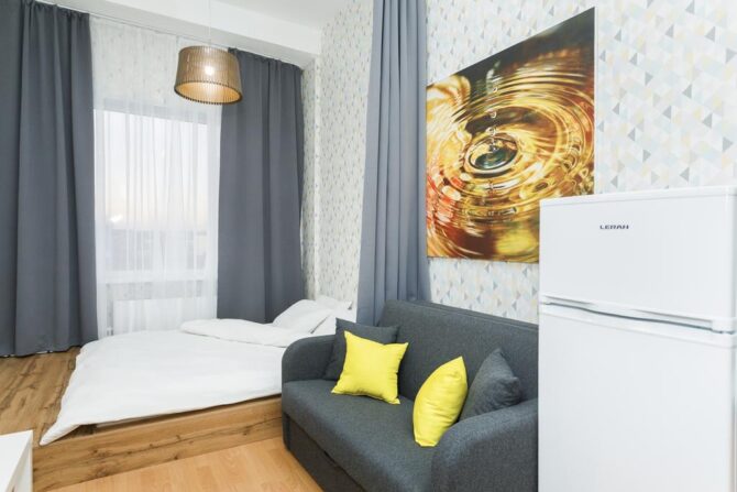 Однокомнатная квартира-студия расположена в новом ЖК поселка Кольцово. Хозяина зовут Дмитрий. Он укомплектовал апартаменты необходимой бытовой техникой, создал условия для комфортного пребывания постояльцев в ожидании своего рейса. Он принимает гостей в любое время суток. В 2-х минутах ходьбы от дома находится автобусная остановка. Отсюда можно уехать в Екатеринбург или в аэропорт.