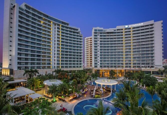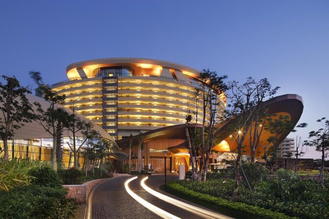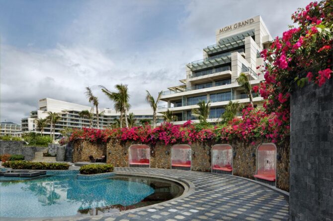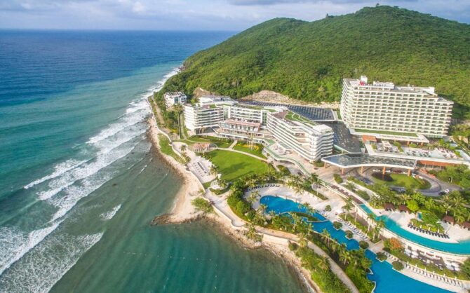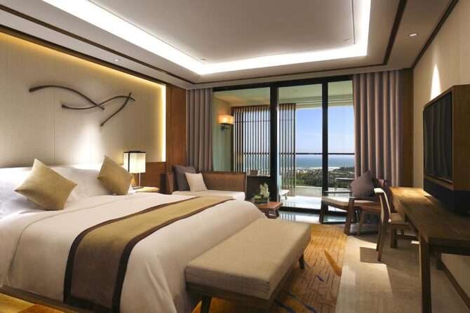 Впечатляющий отельный комплекс на 675 номеров, входящий в знаменитую сеть MGM Grand. Находится в 45 минутах езды от аэропорта и в 20 минутах — от железнодорожного вокзала. Добраться до центральной части Саньи можно за 40 минут на автотранспорте. Все номера гостиницы имеют высококачественную звукоизоляцию, оснащены телевизором с кабельным подключением, док-станцией для подключения iPod, системой кондиционирования, сейфом, мини-баром и набором для самостоятельного приготовления горячих напитков. В ванных комнатах присутствует ванна и душевая кабина, есть фен халат с тапочками.