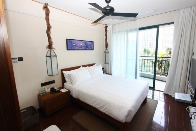 Номера Wyndham Sanya Bay имеют оригинальный дизайн с обилием синего морского цвета, элегантно сочетающегося с деревянными полами светлых оттенков. Постояльцы могут отдохнуть на диване, почитав книгу, посмотреть кабельное телевидение или поработать за письменным столом. В номерах есть мини-бар, холодильник и чайник. Ванные комнаты снабжены полным комплектом банно-косметических принадлежностей, феном и халатом с тапочками.