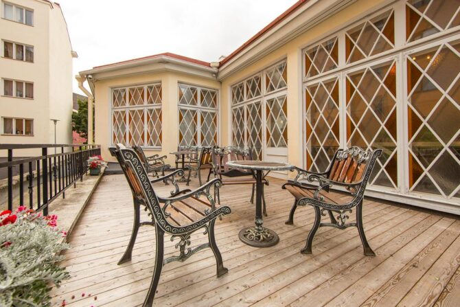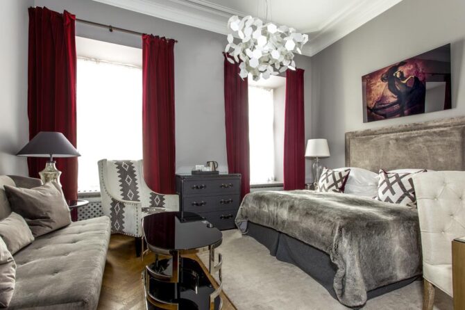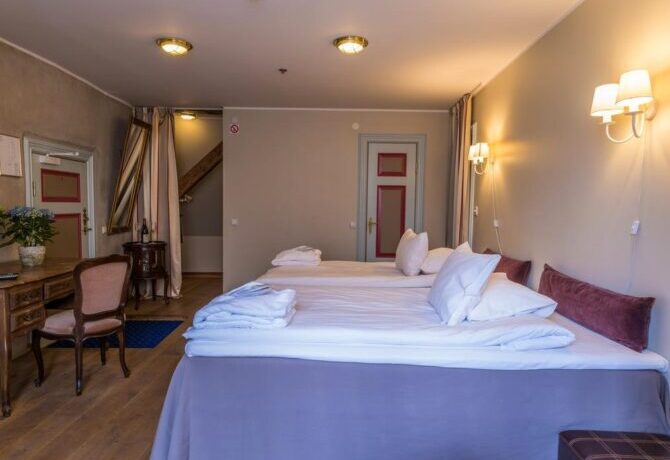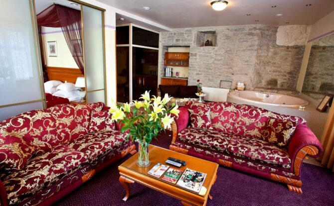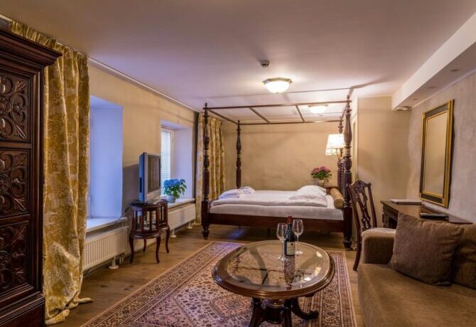 Один из лучших отелей в самом сердце Таллина. Его особенность – неповторимое оформление номеров, каждый из которых имеет свой стиль. В элегантных апартаментах расставлена изысканная мебель, удобные, вместительные шкафы для хранения вещей, а каждый номер имеет гостиную зону, где можно отдохнуть, заказав ужин из ресторана или напитки из бара. Особую атмосферу создают старинные торшеры с оригинальными абажурами, картины и деревянный пол.