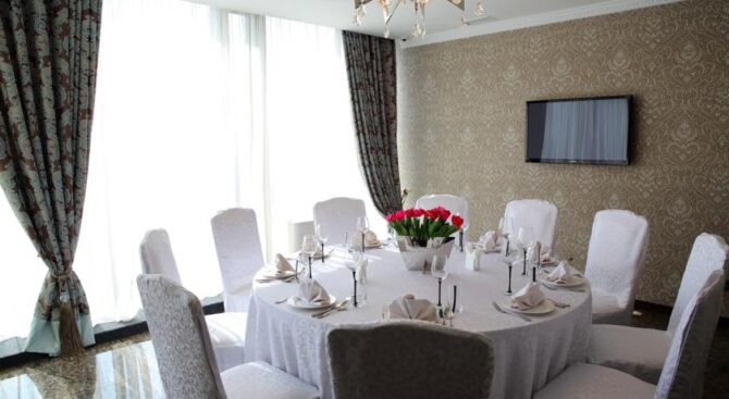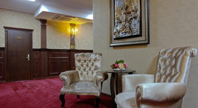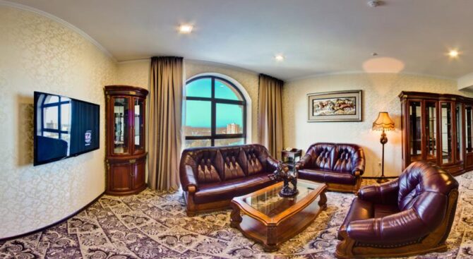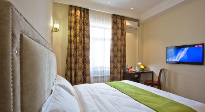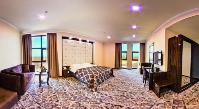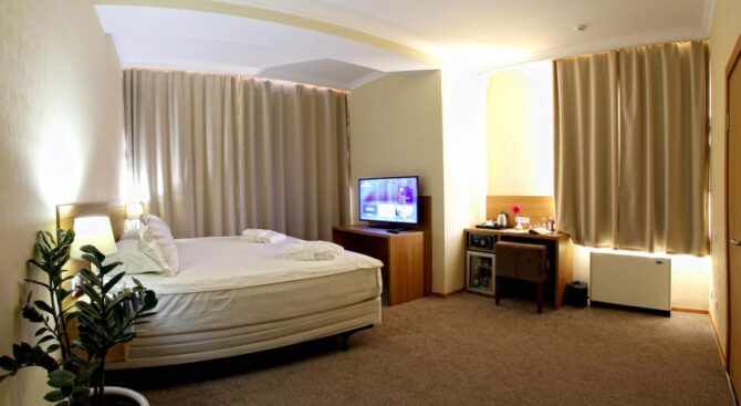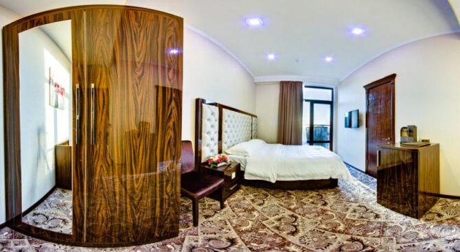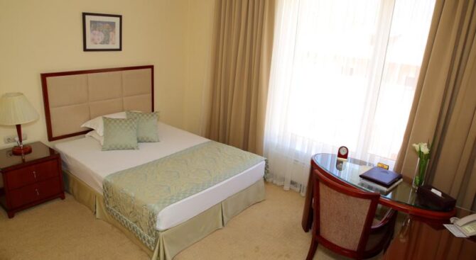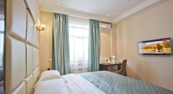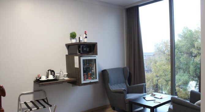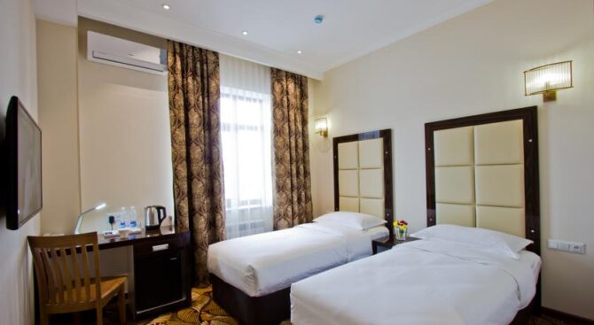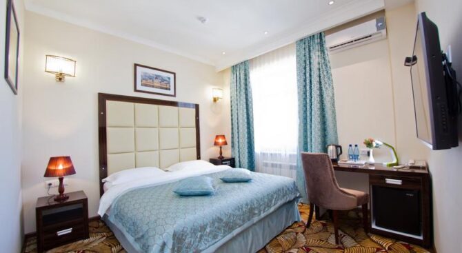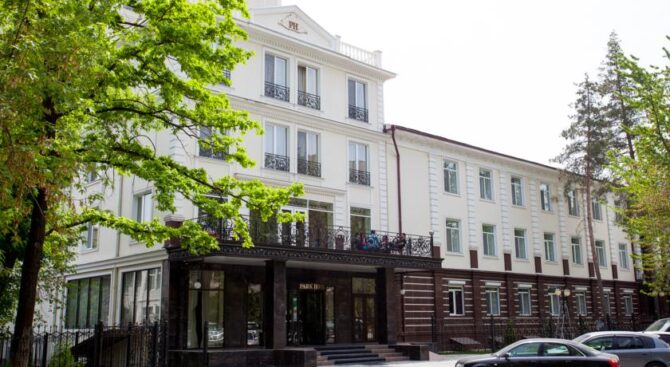Этот большой четырехзвездочный отель славится своим спа-салоном, в котором вы можете не только насладиться сауной и массажем, но и выбрать более изысканные процедуры. В Парк Отеле Бишкек 67 номеров, каждый из которых выполнен в классическом стиле. В номерах есть все для комфортного отдыха: телевизор, чайник, мини-бар, сейф, косметические принадлежности.