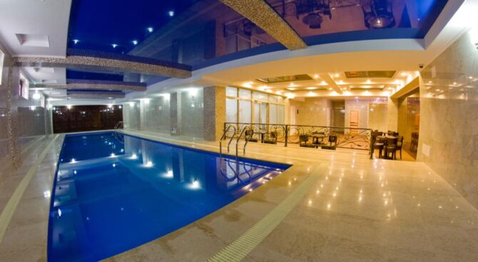 В отеле есть тренажерный зал, бассейн, сауна. В ресторане сервируют блюда средиземноморской и кавказской кухонь. В баре у бассейна госи могут заказать коктейли и блюда, приготовленные на гриле.