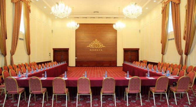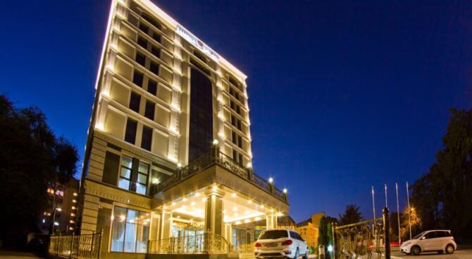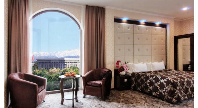 Этот шикарный пятизвездочный отель расположился практически в самом центре Бишкека. В нем 178 номеров, каждый из которых оформлен в современном стиле и оснащен всем для комфортного времяпрепровождения: телевидением, кондиционером, чайными и косметическими аксессуарами. Для тех, кто не может ни на минуту расстаться с домашним любимцем, отель предусматривает размещение с животными.