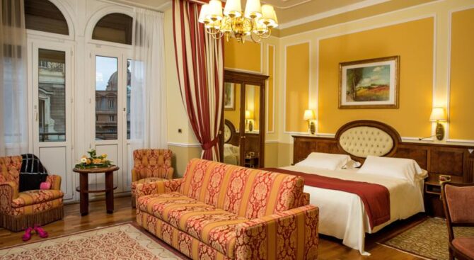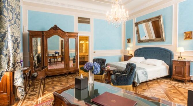 В отделке и интерьере номеров использованы современные материалы. Для удобства гостей – качественная мебель, ТВ и кондиционер. Каждый, поселившийся здесь, сможет почувствовать необыкновенную атмосферу, благодаря богатому убранству холлов и вестибюлей отеля, которые расписаны старинными фресками и украшены картинами известных мастеров.