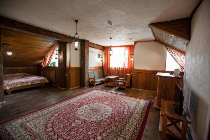 Гостиничные номера обустроены в двухэтажном бревенчатом доме. Он находится в селе Майма-Чергачак (1,5 км от аэропорта). Для размещения гостей предоставляются одно, двух, трех местные номера, семейный и общий номер. Среди них есть один делюкс и один класса «Комфорт». Прямо возле дома останавливается автобус. Время в пути на общественном транспорте до аэропорта составляет 10 минут. В самой гостинице нет объектов общественного питания. Рядом работает кафе «Березка». В окрестностях протекает река Катунь. Ее берег может стать местом для вечерней прогулки. Если заранее договориться с владельцами, то за небольшую доплату здесь примут с домашним животным. Интернет и парковка бесплатные.