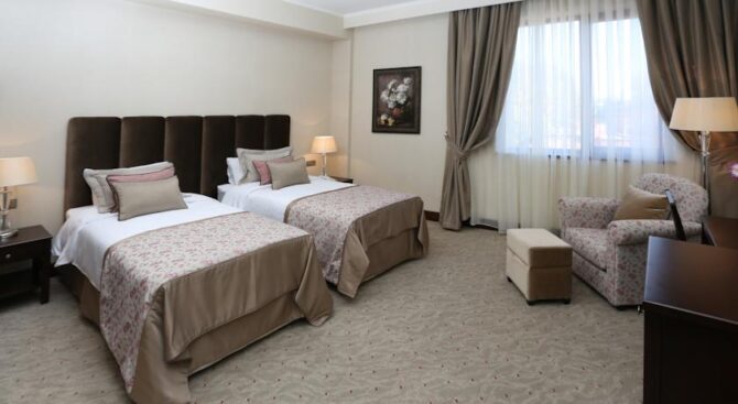 В отеле есть собственный ресторан, в котором подают блюда национальной и европейской кухни, а также несколько баров и кафе, выдержанные полностью в кавказском стиле. На территории отеля гости могут пользоваться тренажерным залом и массажным салоном. До Международного аэропорта – 15 км.