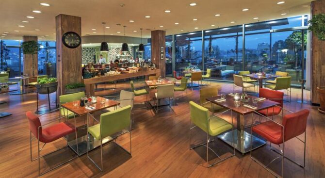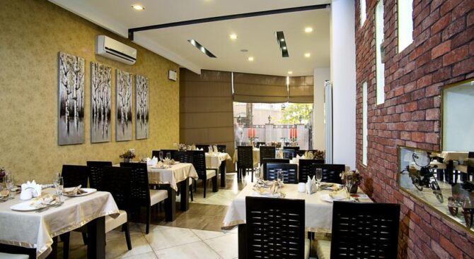 Каждое утро в ресторане отеля сервируют континентальный завтрак в формате «шведский стол», а вечером здесь можно насладиться блюдами национальной кухни и послушать «живую» музыку. Ресторан имеет яркое оформление с элементами кирпича и камня на стенах. Также в отеле есть бар, в котором подаются закуски, горячие блюда и напитки.