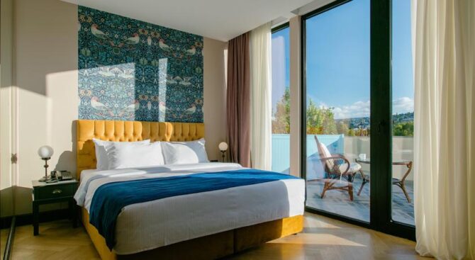 Отель располагает номерами разной комфортности от «стандарта» до роскошных «люксов» с ярким дизайном и отдельными кабинетами для работы. Несмотря на то, что интерьеры отеля выдержаны в классическом европейском стиле, грузинские мотивы в дизайне напоминают о гостеприимной стране. Санузлы всех номеров оснащены современной сантехникой, в некоторых установлены джакузи или ванны с гидромассажем.