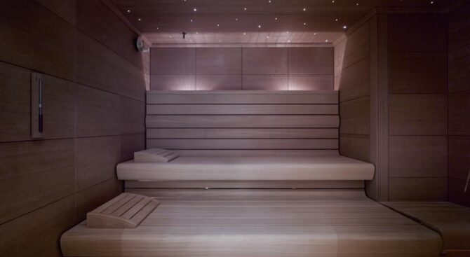 В распоряжении гостей собственный спа-центр, где есть баня, сауна, гидромассаж, бассейн с террасой и зимний сад. Можно заказать массаж, обертывания, ароматерапию. В собственном саду для всех желающих проводят фитнес-тренировки.