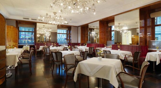 На территории отеля 2 ресторана и 2 бара. Помимо традиционного австрийского меню широко представлена японская кухня. В баре можно поучаствовать в традиционной церемонии венского или английского послеобеденного чаепития. Визитной карточкой отеля является пирог Grand Gugl hupf, который подавали Францу Иосифу. Летняя терраса ресторана открыта с марта по октябрь.