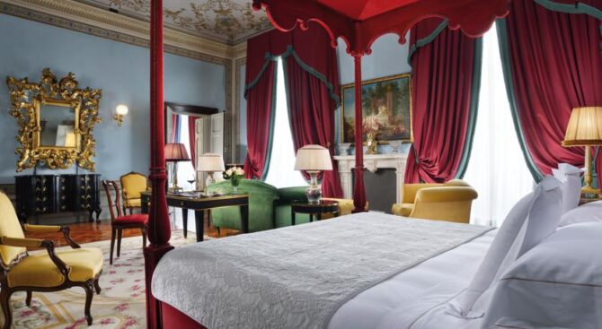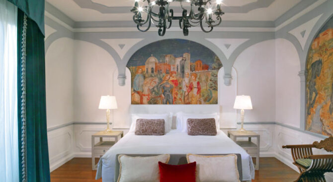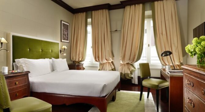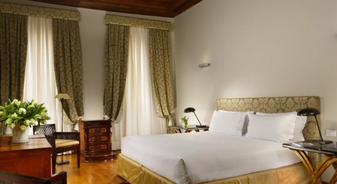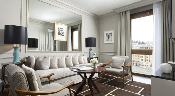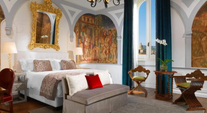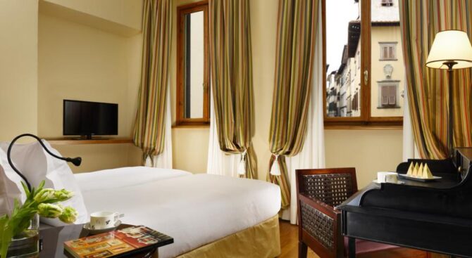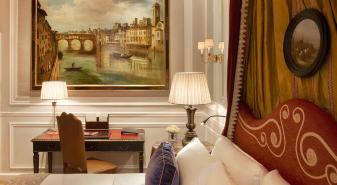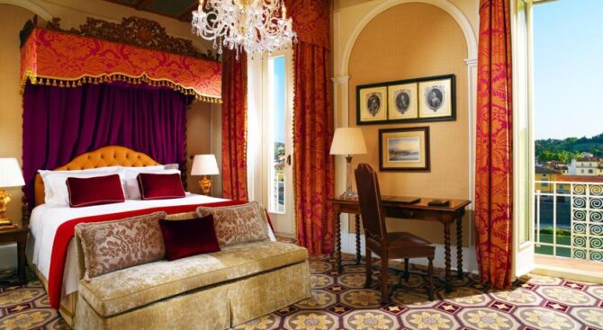 Отель The St. Regis Florence во Флоренции расположен прямо на берегу реки Арно, возле моста Понте-Веккьо, который является одной из главных достопримечательностей города. Гостиница удостоена пятью звездами, а ресторан при ней отмечен звездой Мишлен. При отеле функционирует просторный тренажерный зал и СПА-салон. Помимо ресторана, гости могут посетить бар, где подают легкие закуски и напитки.