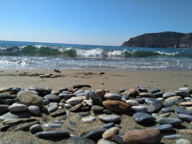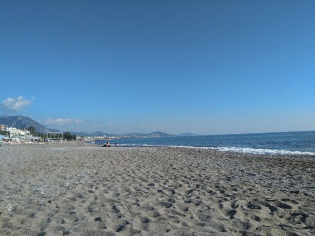Пляж находится прямо возле отеля (около ста метров). Стоит только перейти дорогу (переход относительно безопасный, по светофору), как начинается пляж. Пляж песчано-галечный, а вдоль всего берега в воде тянутся каменные плиты, так что с непривычки можно отбить ноги и получить неприятные впечатления. Сама вода в начале июля была очень теплой, чистой, без волн.