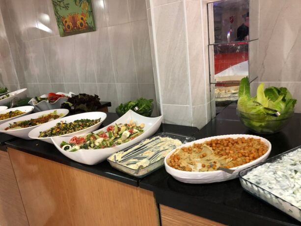 Обеды и ужины намного лучше и разнообразнее. Из мяса давали в основном курицу в тушеном, запеченном, жареном виде (на гриле, шаурму и пр.) и соевые котлеты, пару раз дали печень, грибы. Овощные блюда довольно разнообразны и вполне съедобны: баклажаны в разных вариантах, салаты, подливки, бобовые, рис, макароны, супчики-пюры, огурцы, помидоры, перец, зелень, картофель печеный, жареный и т.д. К напиткам в это время присоединялись местные «Колы», «Фанты», «Спрайты», пиво, вино и некоторый другой алкоголь. Сладостей тут нет никаких (за 10 дней пребывания давали 1 раз пирожные, которые расхватали мгновенно), равно как и вообще какой-либо еды вне завтраков, обедов и ужинов. Из фруктов давали арбузы, яблоки и апельсины.