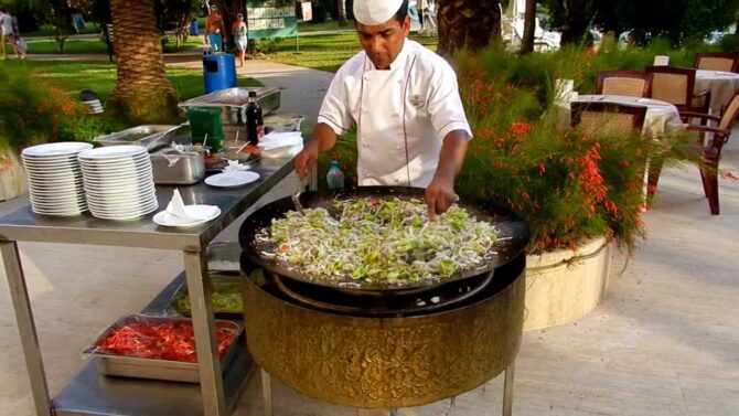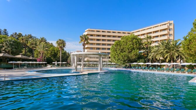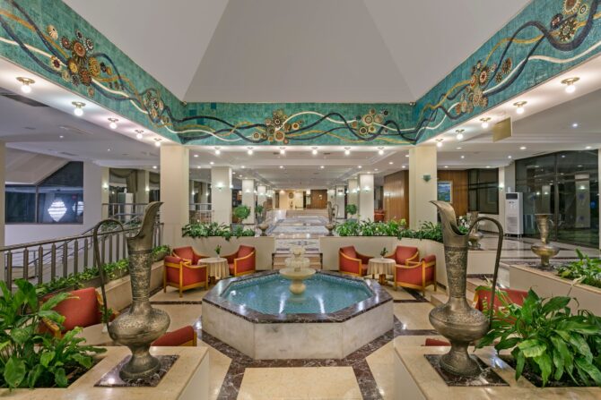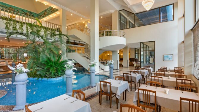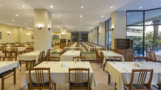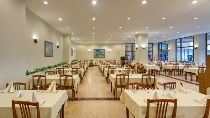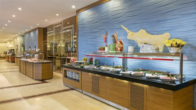 Отдельно поговорим о кухне. Питание здесь проводится в режиме «Все включено», поэтому вы можете попробовать любые блюда, которые приглянутся с 10 утра до 24 часов ночи. «Шведский стол» вас ждет в основном ресторане (общая вместительность 600 человек) на завтрак, поздний завтрак, обед и ужин. Меню меняется каждый день, поэтому вы гарантированно получаете свежие продукты. Здесь есть кондиционер, летняя терраса, а также детское меню (горячее молоко, фруктовые салаты, омлет, йогурты, какао). В диетическое меню входит отварное мясо, овощи, приготовленные на пару, не перченные и слабосоленые блюда. По необходимости вам предложат стульчик для малыша.