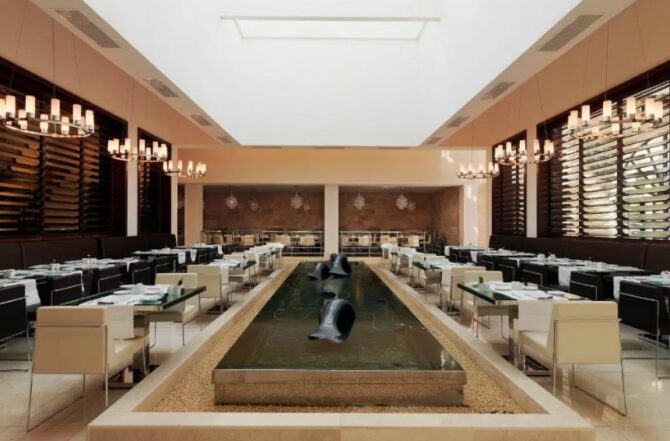 Архитектор Альваро Санса задумывал его как дворец в строгом неоклассическом стиле, но с самым современным дизайном внутри. Вышел забавный, но при этом вполне гармоничный контраст: входишь в здание со строгими пропорциями, прямыми линиями и белыми колоннами, а оказываешься в зале с космически обтекаемыми диванчиками и огромным куполом, под которым висит в воздухе стая сверкающих рыб-модулей.