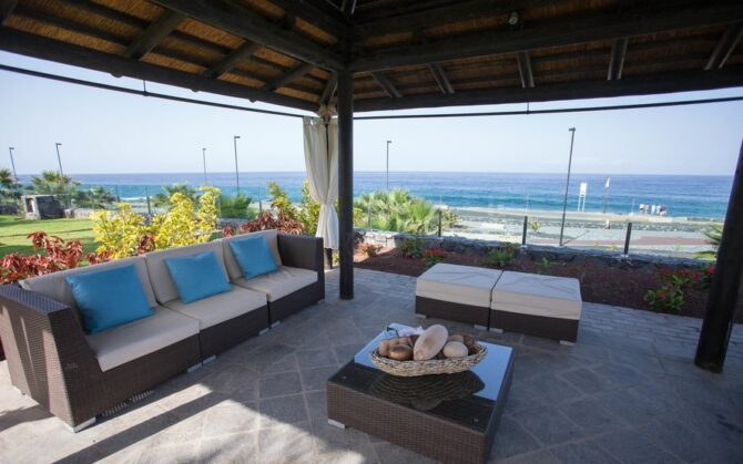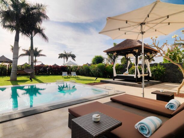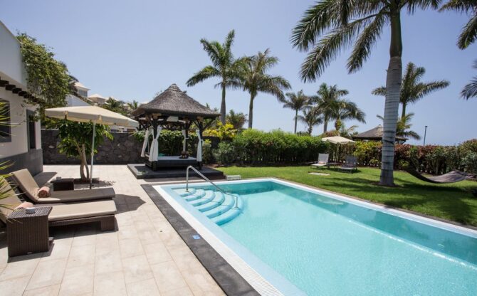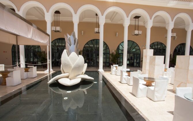 Сразу за ним — открытый дворик-патио со светомузыкальными фонтанами, бассейнами, множеством белоснежных кресел и лежанок. А если пройти еще немного, выйдешь на смотровую площадку, откуда как на ладони будет виден весь курорт со всеми его пышными садами, беседками под тростниковыми крышами, озерами и грандиозным бассейном — самым большим на Канарских островах. Настоящее внутреннее море площадью 5000 кв. м с подогреваемой соленой водой, искусственной лагуной, двумя гидромассажными зонами и 70 подводными лежаками — серьезный конкурент прохладной Атлантике и небольшому мелко галечному пляжу отеля.