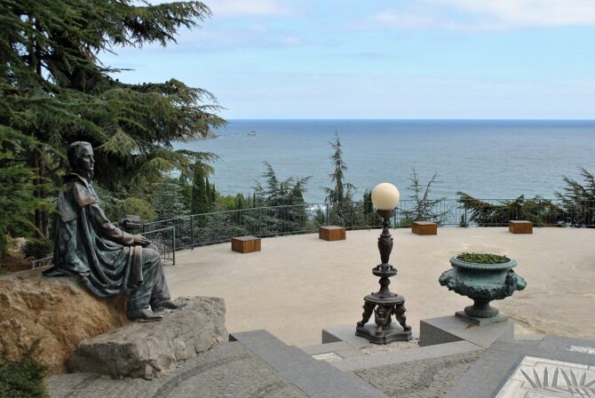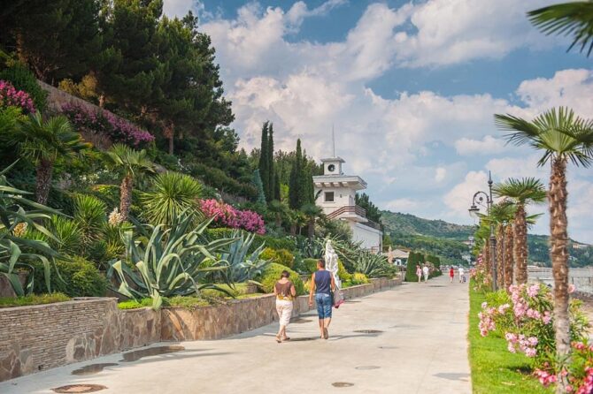 В 19 веке эта земля принадлежала роду Раевских, была засажена разнообразными деревьями. В наше время санаторий принадлежит военным, поэтому вход в парк платный, и строго с документами, но оно того стоит. В советское время над украшением парка потрудились и ученые Никитского ботанического сада, привнесли сюда много пышных растений. Здесь царит атмосфера тишины и гармонии, это отличное место для романтических прогулок и знакомства с редкими растениями.