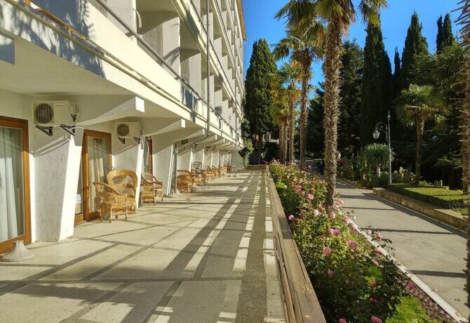 Комплекс состоит из 2 зданий в 5 этажей каждое, одновременно в санатории могут разместиться до 200 человек в 6 различных типах номеров. Санаторий состоит в подчинении Управления делами Президента РФ, и за качеством сервиса здесь внимательно следят. Корпуса стоят на разном удалении от моря, но в любом случае это пешая доступность от пляжа. Гости могут разместиться как в стандартных номерах, так и люксах с апартаментами. Из окон открываются виды на море и парк.