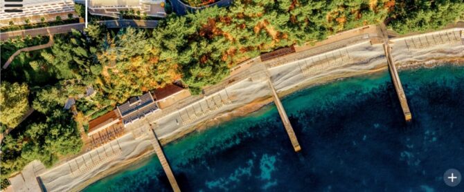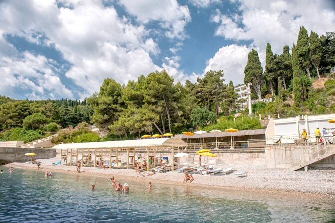 Пляж санатория расположен в 5-10 минутах от корпусов, и дойти до него можно через парк, но также есть бесплатные шаттлы, которые доставят вас на побережье. На пляже мелкая галька, но подходя к воде очень удобные, даже для детей. Гости отдыхают на лежаках под навесами, есть кабинки для переодевания, душ, туалеты и пост спасателя.