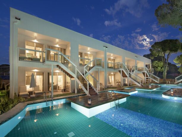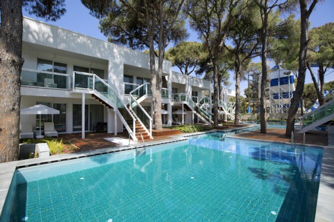 Этот роскошный отель находится на первой линии такого турецкого курорта как Белек. На компактной территории в 60 000 кв. м расположились 2 семиэтажных корпуса и 3 бунгало. Из чего следует вывод, что Папиллон Зюгма — отель не для спокойного уединенного отдыха, потому что в сезон обслуживает в среднем 500-700 гостей.