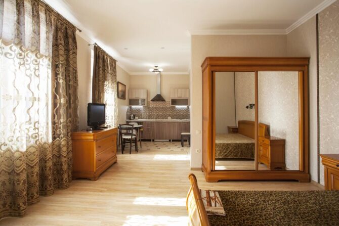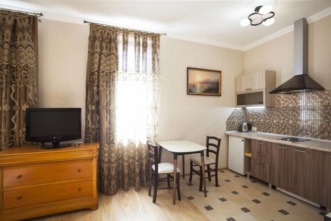 Номера категории апартаменты располагают собственной кухней со всей необходимой посудой и техникой. Это отличный вариант для тех, кто привык к домашней еде даже во время отдыха.