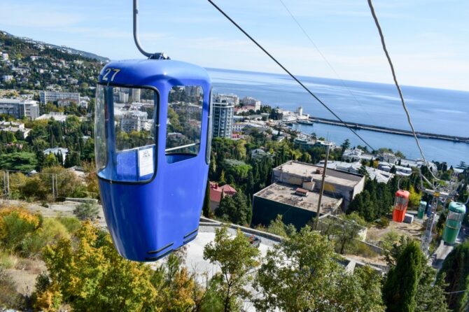 Это прекрасная возможность увидеть Ялту в высоты, но будьте внимательны — в кабинки надо запрыгивать на ходу.