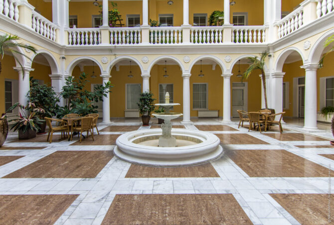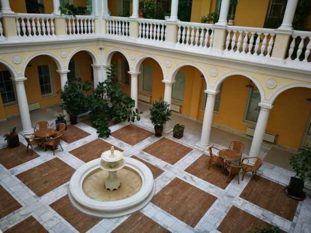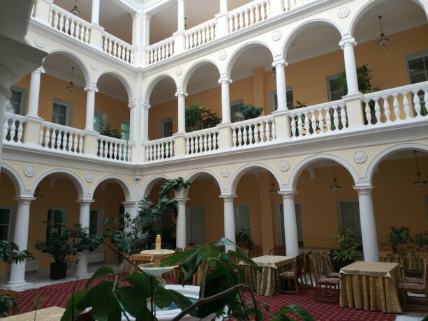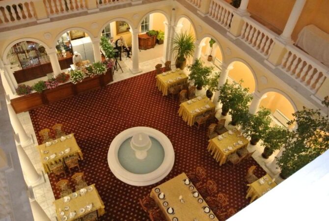Здание отеля расположено в самом центре города, внутренняя инфраструктура небольшая. Главной целью отдыхающих, которые бронируют проживание в “Тавриде” являются номера и само историческое здание, а всеми услугами они могут воспользоваться неподалеку, сейчас об этом расскажем.